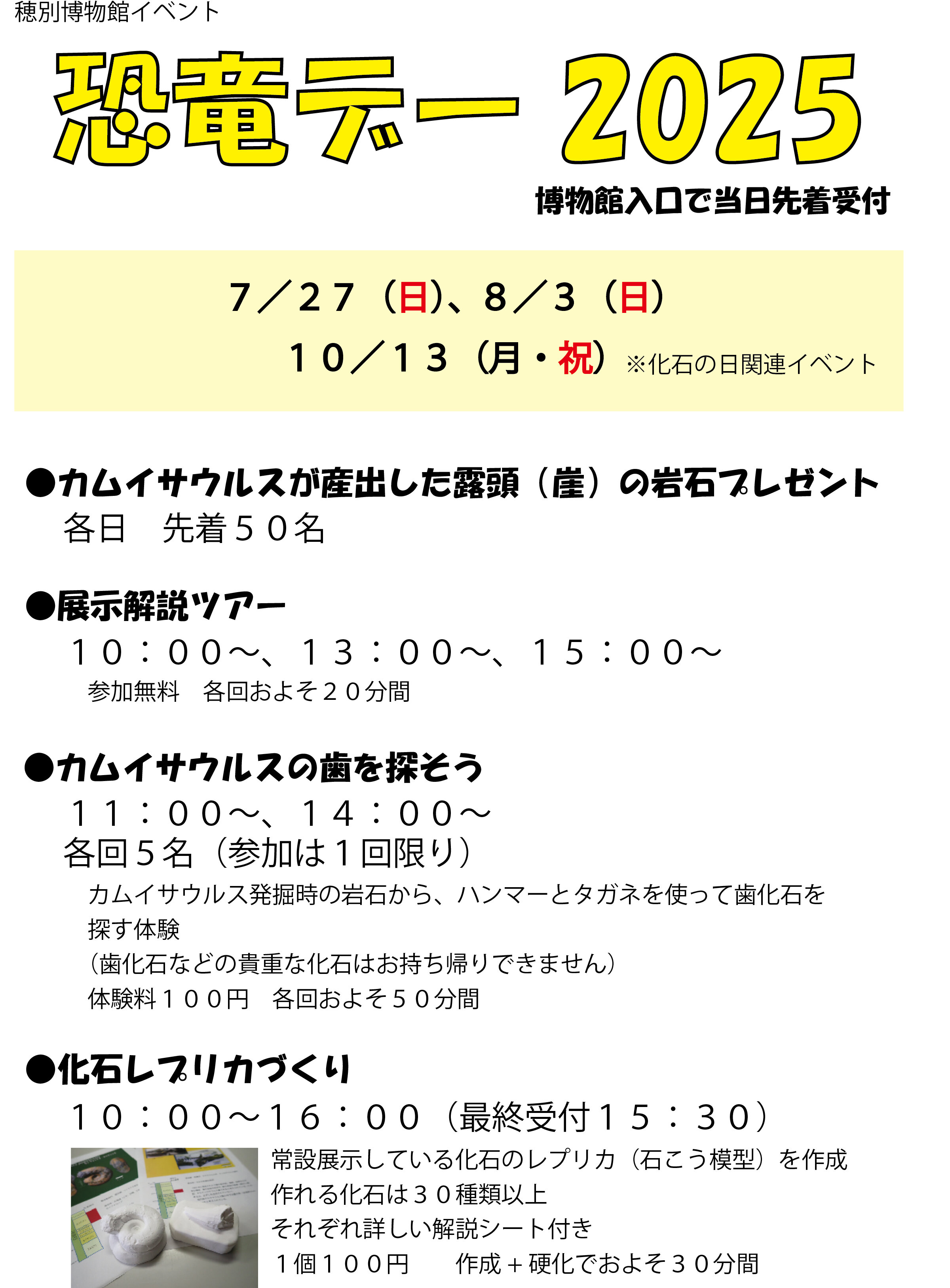 体験学習や講演等が予定されています。古生物関連のものは、体験学習「作って楽しむアンモナイトアクセサリー」、「木の葉化石を探そう」、講演「アンモナイト最新研究2025」などがあります。